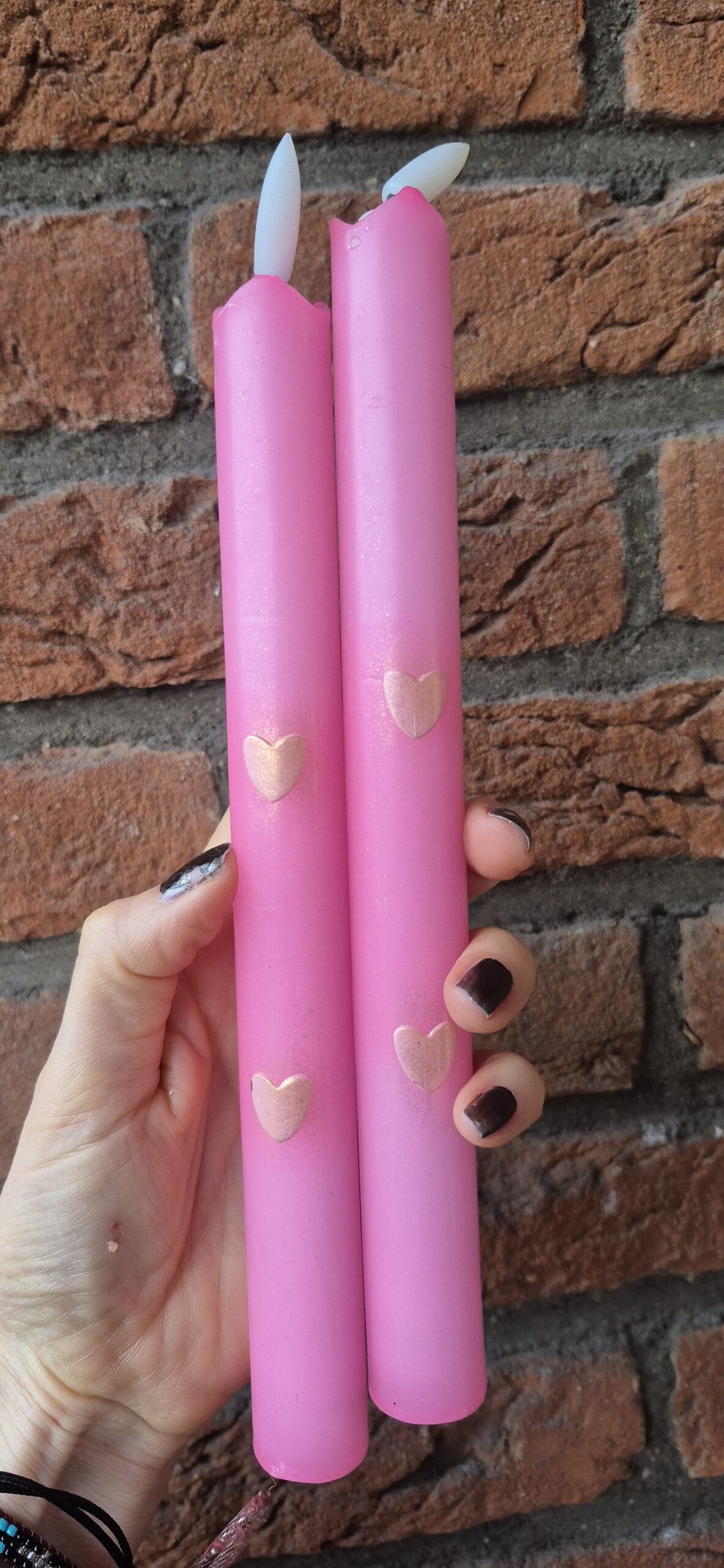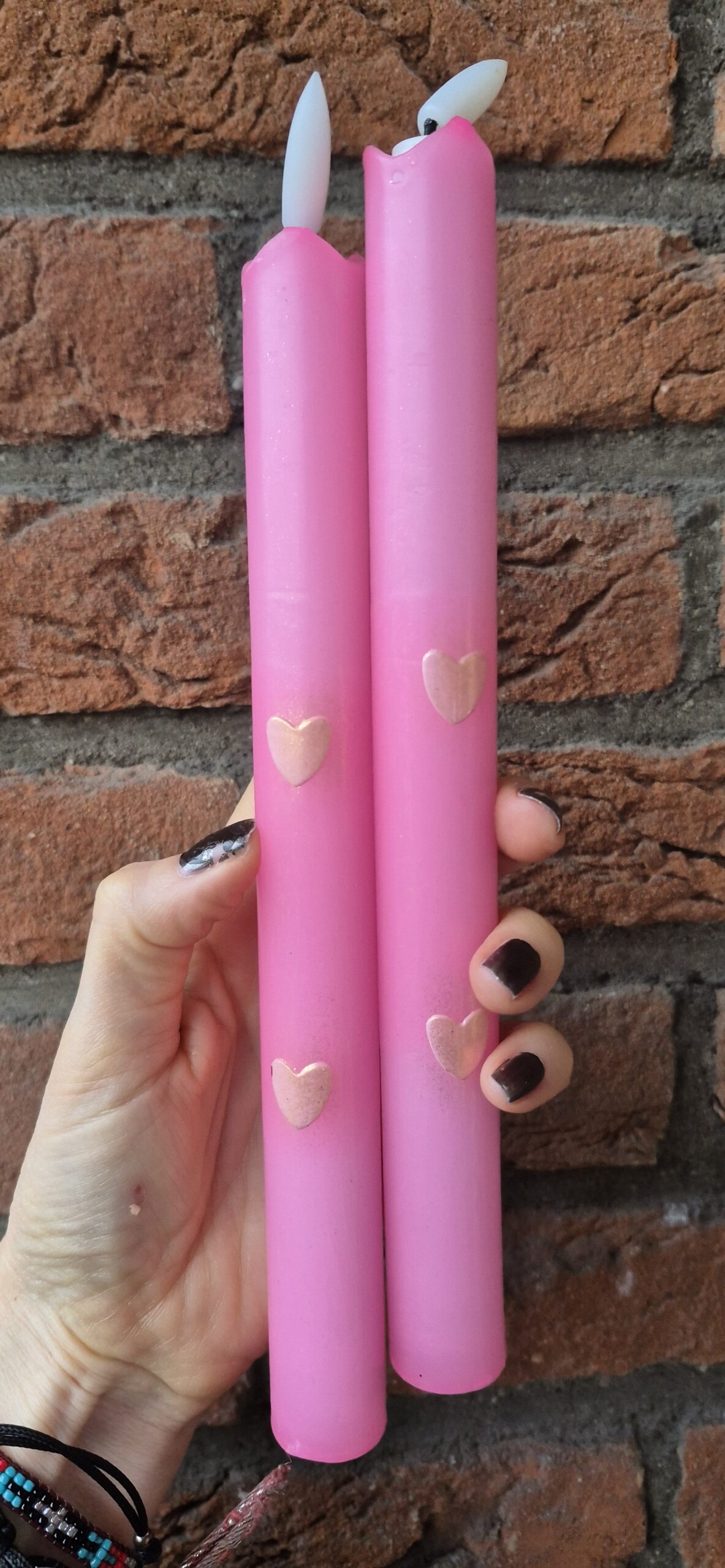 LED Kaarsen Set van 2 – Roze met Metallic Hartjes & Timer